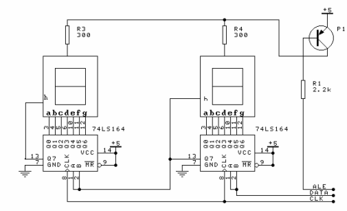 数码管的显示驱动使用74LS164,通过SPCE061A的IOB0和IOB1口对DATA和CLK发送数据。