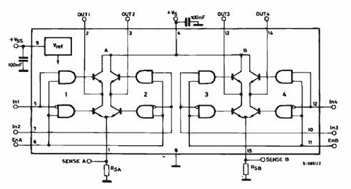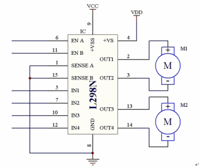 L298N芯片可以驱动两个二相电机(如图1-1),也可以驱动一个四相电机,输出电压最高可达50V,可以直接通过电源来调节输出电压;可以直接用单片机的IO口提供信号;而且电路简单,使用比较方便。