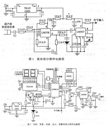 汽车防撞雷达可以帮助驾驶员及时了解车周围阻碍情况,防止汽车在转弯、倒车等情况下撞伤、划伤。其接收部分硬件电路如图3所示,发射、预置\控制、显示部分硬件电路如图4所示。