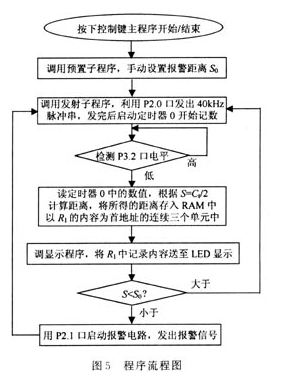 软件设计的主要思路是将预置、发射、接收、显示、声音报警等功能编成独立的模块,在主程序中采用键控循环的方式,当按下控制键后,在一定周期内,依次执行各个模块,调用预置子程序、发射子程序、查询接收子程序、定时子程序,并把测量的结果进行分析处理,根据处理结果决定显示程序的内容以及是否调用声音报警程序。当测得距离小于预置距离时,声音报警程序被调用。图5所示为程序的流程图。