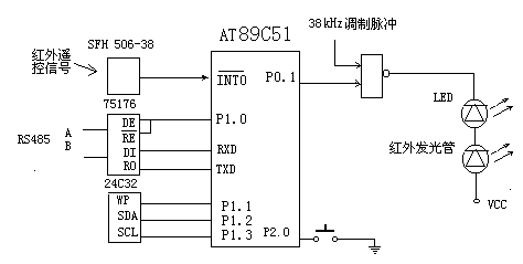单片机同时通过串行口连接上位机PC或集中控制器接收控制命令,上位机或集中控制器通过RS—485总线与单片机通信,从而实现了红外遥控设备的远程控制。
