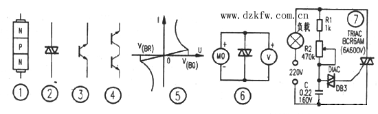图7是双向触发二极管与双向可控硅等元件构成的台灯调光电路。通过调节电位器R2,可以改变双向可控硅的导通角,从而改变通过灯泡的电流(平均值)实现连续调光。如果将灯泡换电熨斗、电热褥还可实现连续调温。