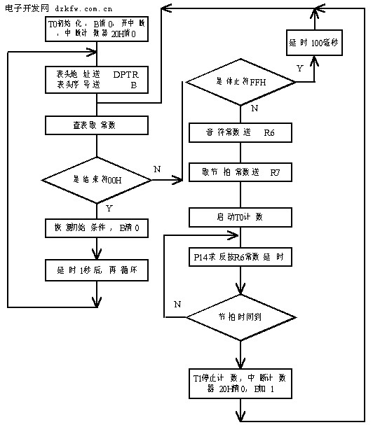 乐曲中,每一音符对应着确定的频率,我们将每一音符的时间常数和其相应的节拍常数作为一组,按顺序将乐曲中的所有常数排列成一个表,然后由查表程序依次取出,产生音符并控制节奏,就可以实现演奏效果。