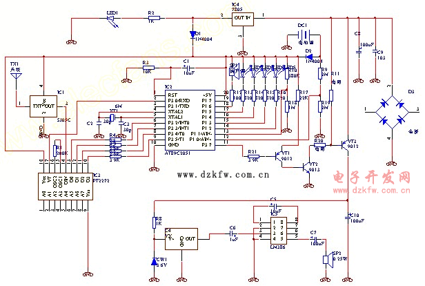 这款无线报警主机对任何发射频率为315M,编码采用PT2262的无线探头都可适用,如无线人体探测器,无线门磁传感器、无线微波探测器等,由于实际使用的环境不同,所需主机与之相配套的设置也不同,网友可以根据自己的发辉,通过编写不同的软件,从而实现不同的功能,这里不再详述。 |