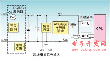 图1是一个典型的应用,其中模拟采样用的信号调理电路、ADC和现场模拟信号不隔离,ADC芯片和CPU电源相互隔离。CPU采用控制系统内部电源。而ADC的+5V电源是由+24V电源经过+24V到+5V电源变换而来的。图中左侧部分是典型的串联、降压非隔离型DC-DC变换器的原理框图。设计中,可以根据开关管的开关频率、+5V消耗电流、要求的输出纹波最大值,计算出电感L1、电容C1的合适大小。