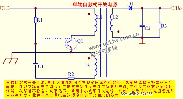 单端自激式开关电源,画出交通通路可以发现变压器的初级两个线圈别离接三极管的三个电极,所以又称电感三点式。三极管既做开关元件又做振动元件,好处是不需要外加控制信号,缺陷是不稳定,功率低下。常用于小功率开关电源,比如一些手机的充电器便是采用这种方式。此种开关电源电路的频率取决于C1和R2的参数。