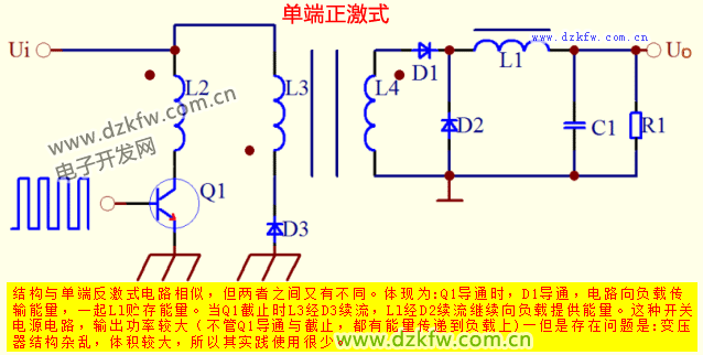 这种开关电源电路,输出功率较大(不管Q1导通与截止,都有能量传递到负载上)―但是存在问题是:变压器结构杂乱,体积较大,所以其实践使用很少。