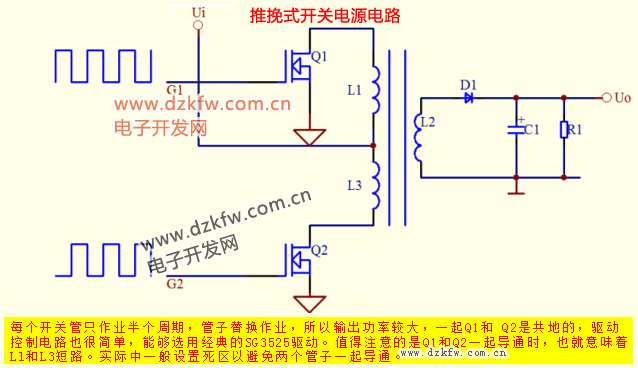 推挽式电路:每个开关管只作业半个周期,管子替换作业,所以输出功率较大,一起Q1和 Q2是共地的,驱动控制电路也很简单,能够选用经典的SG3525驱动。值得注意的是Q1和Q2一起导通时,也就意味着Ll和L3短路。实际中一般设置死区以避免两个管子一起导通。