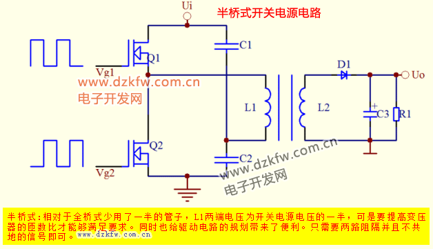 半桥式:相对于全桥式少用了一半的管子,L1两端电压为开关电源电压的一半,可是要提高变压器的匝数比才能够满足要求。同时也给驱动电路的规划带来了便利。只需要两路阻隔并且不共地的信号即可。
