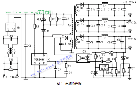 利用TOP249Y设计了一种新型多路输出开关电源,其三路输出分别为5V/10A、12.5V/4A、7V/10A,电路原理如图3所示。该电源设计的要求为:输入电压范围为交流110V~240V,输出总功率为180W.由此可见,选择TOP249Y能够满足要求。