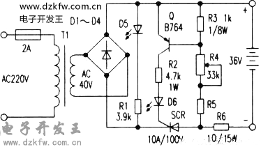 AC220V市电经变压器T1降压,经D1-D4全波整流后,供给充电电路工作。当输出端按正确极性接入设定的被充电瓶后,若整流输出脉动电压的每个半波峰值超过电瓶的输出电压,则可控硅SCR经Q的集电极电流触发导通,电流经可控硅给电瓶充电。脉动电压接近电瓶电压时,可控硅关断,停止充电。调节R4,可调节晶体管Q的导通电压,一般可将R4由大到小调整到Q导通能触发可控硅(导通)即可。图中发光管D5用作电源指示,而D6用作充电指示。