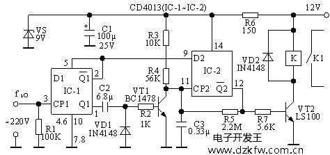 电路中,CD4013中的第一触发器IC-1组成一个双稳态触发器,用来对输入的电源信号整形和二分频。由它的Q1端输出的分频信号作为开光管VT1的开关控制信号。第二触发器IC-2的R3、R4、R5及C3组成频率检测电路,当电源频率超出规定范围时,频率检测电路输出检测信号使VT2导通,切断电源。当双稳态触发器输出脉冲的下降沿使VT1截止时,电容C3通过R3、R4、R5进行充电,如果电源频率较低,电容充电时间将延长,C3上端的电压将会升高,通过R5与R7分压后会使VT2导通,继电器吸和,它的常闭触点将电源断开。在电源频率正常时,由于开关管VT1关断的时间小于电容C3的充电时间常数,C3上端的充电电压达不到VT2的导通电压,被控设备将正常工作。