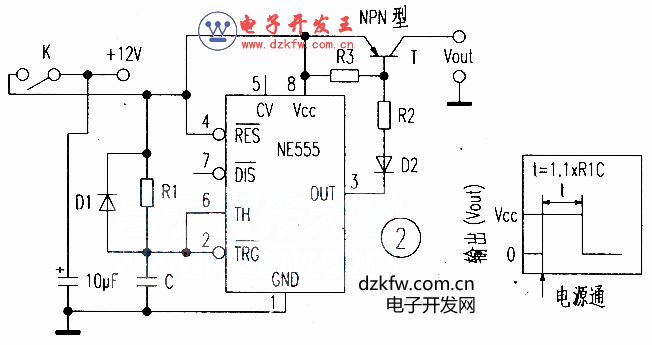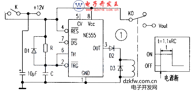 在图1、图2的电路工作时.只要手动开关K接通+12V电源.由NE555组成的单稳态电路工作,其③脚输出高电平。在图1电路中,由继电器触点K与Vout接通+12v电源供外接负载使用:在图2电路中,当晶体管T(PNP型)导通,其Vout与+12V电源接通,供外接负载使用。