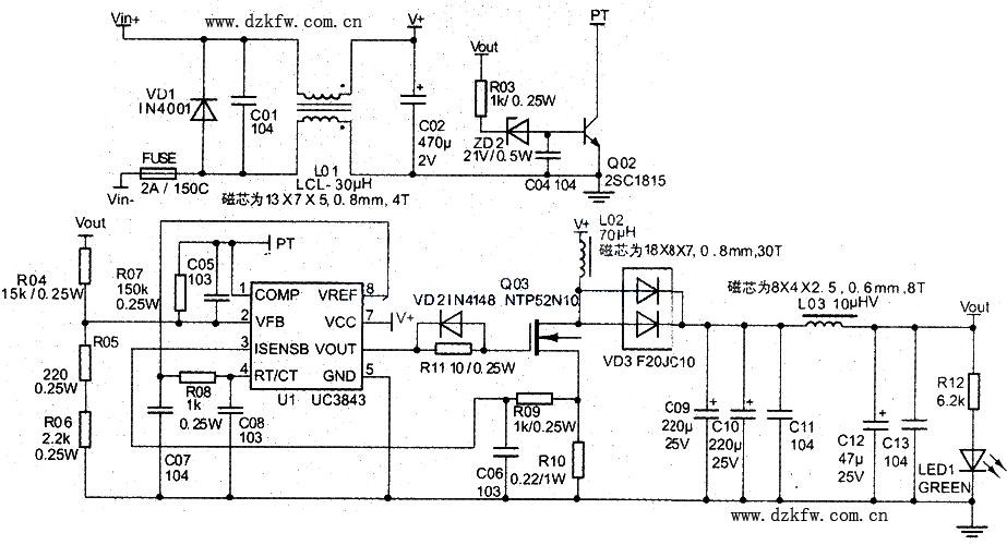 电路如上图,此电路属升压型稳压电路,采用UC3843作为控制lC,可将10.5~15V直流输入电压转换为直流19V,最大输出电流约为3A,效率在82%~87%左右。电路的原理很简单,就是通过IC输出的脉冲控制开关管Q03的开与关,将电感L02上产生的反电动势叠加到输入电压上,使得输出电压升高。再通过IC占空比的调整,得到所需要的稳定的19V输出电压。UC3843的工作频率由其4脚外接的RC数值决定,本电路约为170kHz。输出电压的数值则由其2脚外接的分压电阻的阻值决定,通过改变电阻的大小比例,就可以在一定范围内得到所需的电压了。下图为对应的PCB图。