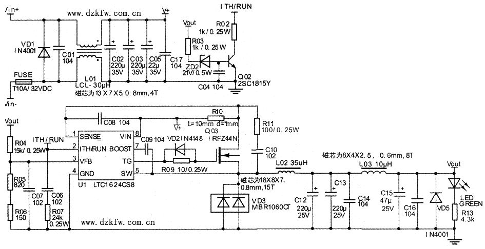 电路如下图,这里的电路就是降压型的稳压器了,为了获得更高的转换效率,在此采用的是Linear公司的表贴安装产品LTC1624CS8,这是一种定频为200kHz的电路。