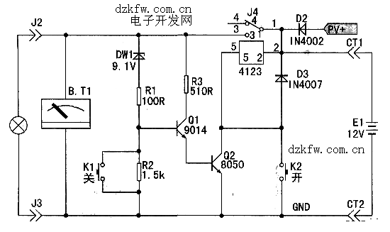 电路是由蓄电池、控制器、用电器及充电部分组成。其中:稳压二极管DWl、电阻R1、R2组成欠电压检测电路,三极管Q1、Q2及电阻R3和继电器组成欠电压自动断电控制、执行电路。K1、K2分别为手动“关”、“开”机按钮开关,PV+是太阳能电池板充电输入正极接线端。负载最好用直流1 2V电子节能灯。