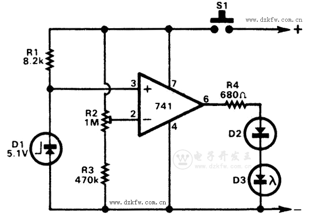一个741运算放大器可用作电压比较器。同相输入和一个齐纳对照源连接。参考电压是5.1V。调整R2可使同相输入的电压变成电源电压的一半。当电源电压高于10.2V时,发光二极管不会发亮。