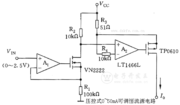 该电路的恒定输出电流能在0~50mA的范围内调节,对应的压控电压范围为0~2.5V。电路采用了微功耗精密运算放大器LT1466L。
