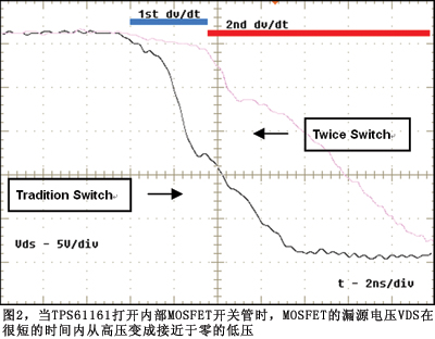 图2当TPS61161打开内部MOSFET开关管时MOSFET的漏源电压Vds在很短的时间内从高压变成接近于零的低压