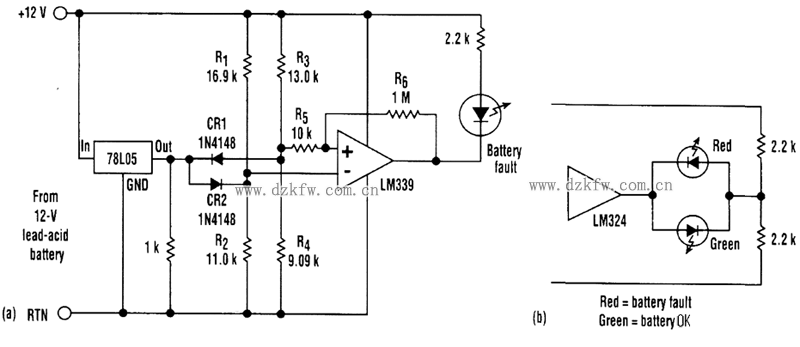 其中一个探测器的典型应用包括监控铅酸电池。它表明在故障时,电池外部电压为11至14V。由于该电路是由电池供电,输入和基准分别切换成使比较器输入保持在其共模范围。