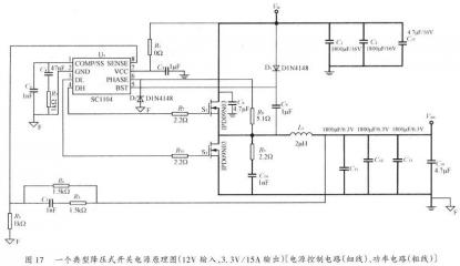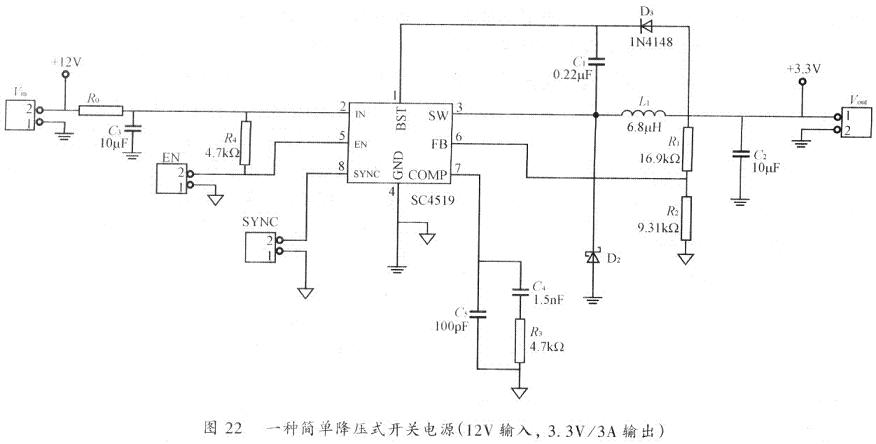 图22是另一种降压式开关电源,该电源能使12V输入电压转换成3.3V输出电压,输出电流可达3A。此电源上使用了一个集成电源控制器(Semtech型号SC4519)。这种控制器将一个功率管集成在电源控制器芯片中。这样的电源非常简单,尤其适合应用在便携式DVD机,ADSL,机顶盒等消费类电子产品。