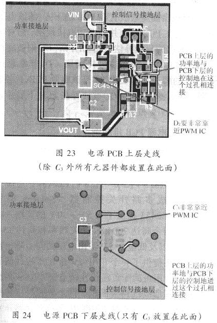 图23是该电源PCB上层排版图。为了力便读者理解,功率接地层和控制信号接地层分别用不同颜色来表示。在这里输入插座被放置在PCB的上方,而输出插座被放置在PCB的下方.滤波电感(L1)被放在PCB左边并靠近功率接地层,而对于噪音较敏感的反馈补偿电路(R3,C4,C5)则被放存PCB右边并靠近控制信号接地层。D2非常靠近SC4519的脚3及脚4。图24是该电源PCB下层排版图。输入滤波电容(C3)被放置在PCB下层并非常靠近SC4519和功率接地层。