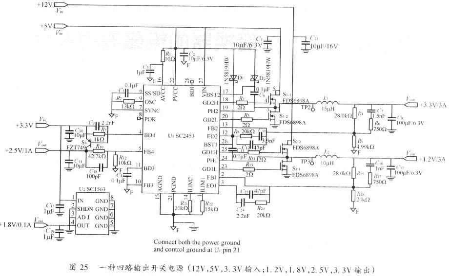 最后讨论一种多路输出开关电源PCB排版要点。此电源有3组输入电压(12V,5V和3.3V),4组输出电压(3.3v,2.6V,1.8V,1.2V)。该电源使用了,一集成多路开关控制器(Serotech型号SC2453)。SC2453提供了4.5V~30V的宽输入电压范围,两个高达700kHz开关频率和高达15A输出电流,以及低至0.5V输出电压的同步降压转换器。它还提供了一个专用可调配正压线性调节器和一个专用可调配负压线性调节器。TSSOP-28封装减小了所需线路板面积。两个异相降压转换器可以减小输入电流纹波。图25是这种多路开关电源的原理图。其中3.3V输出由5V输人产生,l.2V输出由12V输入产生,2.6V和1.8V输出由3.3V输入产生。由于该电源上所有元器件都必须被放置在一个面积较小的PCB上,为此必须将电源的功率地层和控制信号地层分隔开来。参照前面几节中讨论过的要点,首先将图25中连接到功率地层的元器件和连接到控制信号地层的元器件区分开来,然后将控制信号元器件放在信号地层上并靠近SC2453控制信号地层与功率地层通过单点相连接。这连接点通常会选择在控制芯片的接地脚(SC2453中的脚21)。图26详细描述了该电源排版方式。
