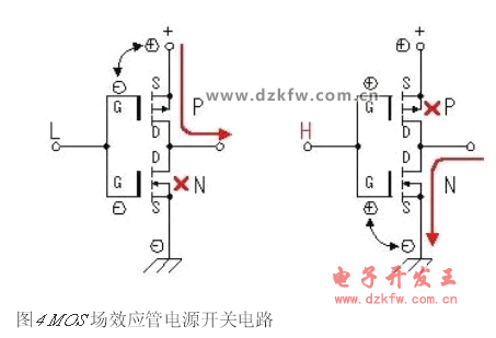 下面简述一下用C-MOS场效应管(增强型MOS场效应管)组成的应用电路的工作过程(见图4)。电路将一个增强型P沟道MOS场效应管和一个增强型N沟道MOS场效应管组合在一起使用。当输入端为低电平时,P沟道MOS场效应管导通,输出端与电源正极接通。当输入端为高电平时,N沟道MOS场效应管导通,输出端与电源地接通。在该电路中,P沟道MOS场效应管和N沟道MOS场效应管总是在相反的状态下工作,其相位输入端和输出端相反。通过这种工作方式我们可以获得较大的电流输出。同时由于漏电流的影响,使得栅压在还没有到0V,通常在栅极电压小于1到2V时,MOS场效应管既被关断。不同场效应管其关断电压略有不同。也正因为如此,使得该电路不会因为两管同时导通而造成电源短路。