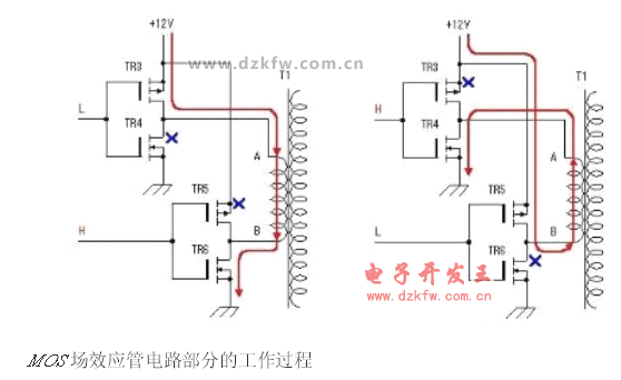 由以上分析我们可以画出原理图中MOS场效应管电路部分的工作过程(见图5)。工作原理同前所述。这种低电压、大电流、频率为50Hz的交变信号通过变压器的低压绕组时,会在变压器的高压侧感应出高压交流电压,完成直流到交流的转换。这里需要注意的是,在某些情况下,如振荡部分停止工作时,变压器的低压侧有时会有很大的电流通过,所以该电路的保险丝不能省略或短接。