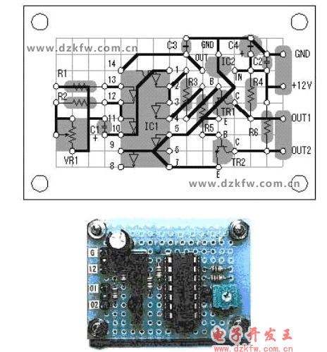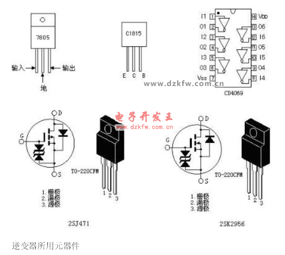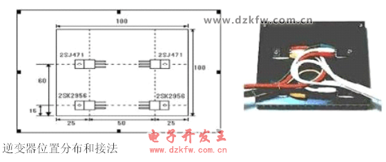 电路板见图6。所用元器件可参考图7。逆变器用的变压器采用次级为12V、电流为10A、初级电压为220V的成品电源变压器。P沟道MOS场效应管(2SJ471)最大漏极电流为30A,在场效应管导通时,漏-源极间电阻为25毫欧。此时如果通过10A电流时会有2.5W的功率消耗。N沟道MOS场效应管(2SK2956)最大漏极电流为50A,场效应管导通时,漏-源极间电阻为7毫欧,此时如果通过10A电流时消耗的功率为0.7W.由此我们也可知在同样的工作电流情况下,2SJ471的发热量约为2SK2956的4倍。所以在考虑散热器时应注意这点。图8展示本文介绍的逆变器场效应管在散热器(100mm×100mm×17mm)上的位置分布和接法。尽管场效应管工作于开关状态时发热量不会很大,出于安全考虑这里选用的散热器稍偏大。