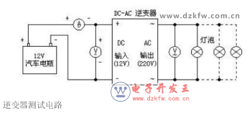 测试电路见图9.这里测试用的输入电源采用内阻低、放电电流大(一般大于100A)的12V汽车电瓶,可为电路提供充足的输入功率。测试用负载为普通的电灯泡。测试的方法是通过改变负载大小,并测量此时的输入电流、电压以及输出电压。输出电压随负荷的增大而下降,灯泡的消耗功率随电压变化而改变。我们也可以通过计算找出输出电压和功率的关系。但实际上由于电灯泡的电阻会随受加在两端电压变化而改变,并且输出电压、电流也不是正弦波,所以这种的计算只能看作是估算。