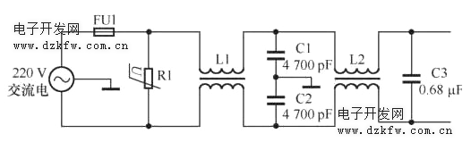 图中所示是X电容和Y电容应用电路,这是开关电源的220V交流输入电路,也称为瞬变滤波电路或称为EMI滤波器。电路中的R1为压敏电阻器,L1和L2是铁氧体线圈,FU1为熔断器。