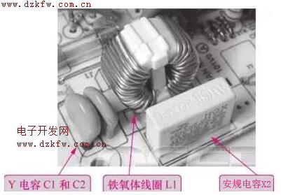 图中电容为安规电容,分为X电容和Y电容,它们用于EMI/RFI抑制中。EMI(ElectroMagneticInterference)意为电磁干扰,RFI(RadioFrequencyInterference)意为射频干扰。