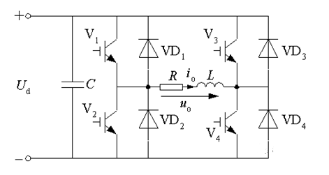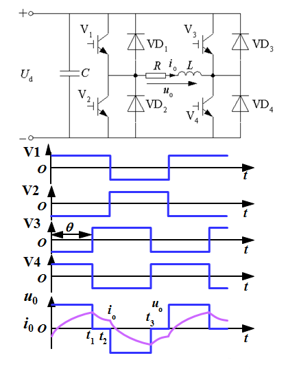 全桥逆变电路结构四个开关管和四个续流二极管构成两个桥臂,可看成两个半桥电路的组合;输出电压合电流波形与半桥电路形状相同,幅值高出一倍;