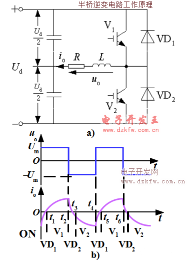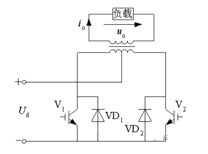 交替驱动两个IGBT,经变压器耦合给负载加上矩形波交流电压;两个二极管的作用也是提供无功能量的反馈通道;变压器匝比为1:1时,uo和io波形及幅值与全桥逆变电路完全相同。