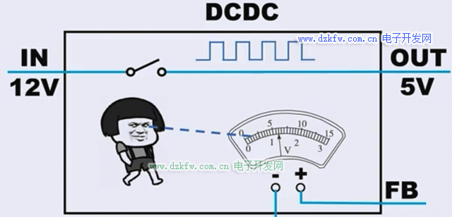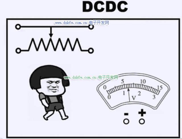 首先呢我们还是先简单的介绍一下两种芯片的这个原理。对于LDO来说,它的内部我们可以看成是由一个小人,一个可调电阻,一个电压表所组成的。那这个小人他时时刻刻都在观察这个输出的电压值。当输出的电压高于5V的时候呢,小人就会增加可调电阻的值。而输出电压低于5V的时候呢,小人就会减小可调电阻的值,通过不停的调节可调电阻的值,就可以保证输出电压的恒定了。那这种方式最大的缺点就是多余的7V电压其实是被这个可调电阻消耗掉的,因此可调电阻的发热有可能会很大,而且总体的转换效率也会很低。那在DCDC的内部,我们也可以看成是有一个小人,一个电压表,只是说把这个可调电阻换成了一个开关,此时这个小人就会做两件事情。第一件事情他会周期性的开关,这个开关产生一个PWM波。第二件事情呢仍旧是不停的去看这个电压表。当他发现输出高于5V的时候,他就会让这个开关断开的时间稍微长一点,也就是PWM波低电平的时间会长一点。那当他发现这个输出电压低于5V的时候呢,就会让这个开关闭合的时间长一点。也就是PWM波高电平的时间长一点,这样子的话就可以让输出电压稳定在5V了。这种情况下呢,多余的7V电压其实是被这个开关拦截掉了,芯片本身就不需要去承担这个多余的电压,所以发热会小的很多。到这里呢DCDC 和LDO的各自优缺点基本上就看出来了。