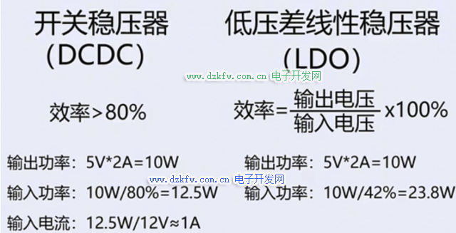 对于LDO来说呢,效率基本上就等于输出电压除以输入电压乘以百分之一百,所以这个压差越大,效率就越低,还是以12V转5V为例,它的效率基本上连42%都不到。所以你需要让LDO 输出2A的话,那么就至少需要选一个12V2A的输入电源显然远远不如DCDC来的划算。