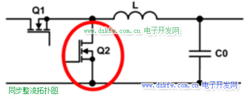 若在电路中续流回路中使用的也是MOS管(Q2),即上下管都是MOS管,因为MOS管本身是需要外控制的元器件,整流过程中必须根据电源的开关时序同步控制Q1与Q2,所以该电路为同步,同步电路如图2所示: