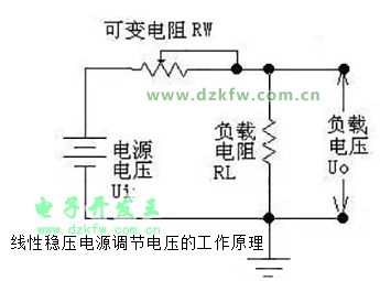 采用下图来说明线性稳压电源调节电压的工作原理,如图所示可变电阻RW跟负载电阻RL组成一个分压电路,输出电压为: