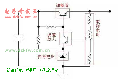 如果用一个三极管或者场效应管来代替图中的可变阻器,并通过检测输出电压的大小,来控制这个“变阻器”阻值的大小,使输出电压保持恒定,这样我们就实现了稳压的目的。这个三极管或者场效应管是用来调整电压输出大小的,所以叫做调整管。