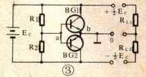 图3电路是在图l基础上增加两个三极管,加强了电路的带负载能力,其输出电流的大小取决于BG1和BG2的最大集电极电流ICM。通过反馈回路可使两路负载不相同时也能保持正负电源基本对称。例如由负载不等引起Ub下降时,由于Ua不变(R1,R2分压供给一恒定Ua),使BGl导通,BG2截止,使 RL2流过一部分BGl的电流,进而导致Ub上升。当RL1、RL2相等时BG1、BG2均处于截止状态。R1和R2可取得较大。
