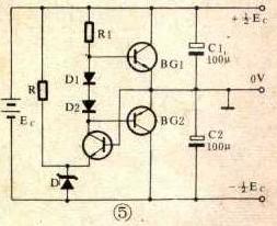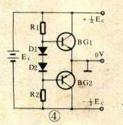 图4的电路又对图3电路进行了改进。增加的两个偏置二极管使二个三极管偏离了死区,加强了反馈作用,使得双电源有较好的对称性和稳定性。D1、D2也可用几十至几百欧的电阻代替。