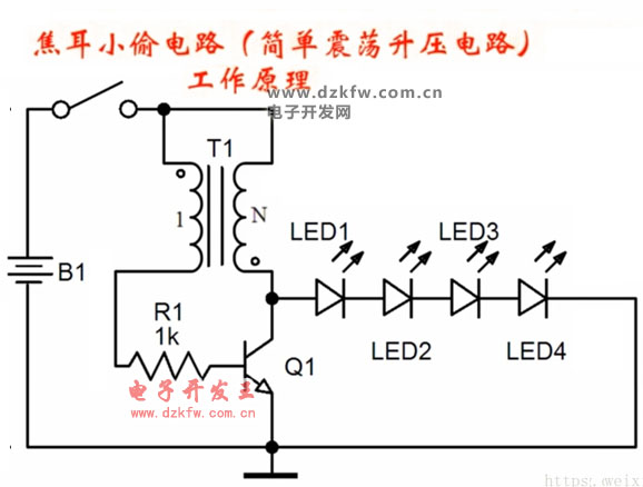 4. 当线圈中储存的磁场能消耗完后,系统又重复1到3步,Q1在导通和截止状态之间迅速转换,右侧线圈产生的感应电动势时而上正下负时而上负下正。