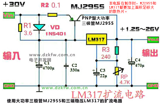本电路在制作时,MJ2955和LM317都要加上面积足够大的散热片。