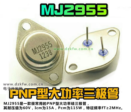 MJ2955是一款很常用的PNP型大功率硅三极管,其耐压值为60V,Icm为15A,Pcm为115W,特征频率fT≥2MHz。