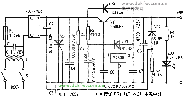 本电源正常工作时输出电压为5V,晶闸管VS呈截止状态。当由于某种原因(如集成电路损坏或调整管击穿)使输出电压超过限定值时(即≥5.6v),稳压管VD7击穿,这样电阻R3上的电压VR3升高使晶闸管Vs触发导通,引起熔丝管Fu熔断,从而保护了负载。