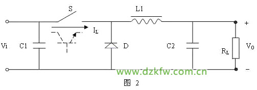 开关电源就是采用功率半导体器件作为开关元件,通过周期性通断开关,控制开关元件的占空比来调整输出电压。开关元件以一定的时间间隔重复地接通和断开,在开关无件接通时输入电源Vi通过开关S和滤波电路向负载RL提供能量,当开关S断开时,电路中的储能装置(L1、C2、二极管D组成的电路)向负载RL释放在开关接通时所储存的能量,使负载得到连续而稳定的能量。