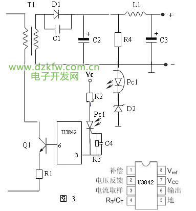 在用万用表测量次级元件,排除了高频整流二极管击穿、负载短路的情况后,如果这时输出为零,则可以肯定是电源的控制电路出了故障。若有部分电压输出说明前级电路工作正常,故障出在高频整流滤波电路中。高频滤波电路主要由整流二极管及低压滤波电容组成直流电压输出,其中整流二极管击穿会使该电路无电压输出,滤波电容漏电会造成输出电压不稳等故障。用万用表静态测量对应元件即可检查出其损坏的元件。例:某一24伏直流电机供电电源通电后无直流24伏输出 ,拆开电源外壳,观察保险丝未烧断且电路板无明显的烧焦处或破裂元件,在未通电情况下量AC输入端阻值和DC输出端阻值正常,量开关管、整流桥、整流管等重要元件正常,故判断不存在内部严重短路的可能,估计保护电路动作。经检查此开关电源采用U3842 PWM控制芯片,经查找相关的资料得知,当U3842芯片的3端电压高于1伏时,内部电流敏感比较器输出高电平,将PWM锁存器复位使输出关闭。通电测量U3842的3端高于1伏,6端无输出,经检查相关电路,发现稳压管D2击穿,如图3,故PC1导通,致使U3842的3端为高电平,故6端无输出,开关管不工作,直流侧无直流输出。更换同型号稳压管D2,故障解除。电源负载能力差电源负载能力差是一个常见的故障,一般都是出现在老式或工作时间长的电源中,主要原因是各元器件老化,开关管的工作不稳定,没有及时进行散热等。应重点检查稳压二极管是否发热漏电,整流二极管损坏、高压滤波电容损坏等。