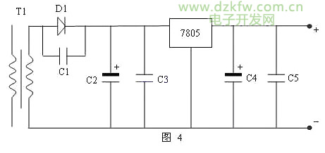 例:我厂近红处激光光谱仪(VECTOR 22),开机后无法完成自检并报警且主板指示灯不断闪烁。经检查,供光谱仪主板的直流5V电源仅剩2.3伏左右,脱开5V直流电源的负载,通电再次测量5V直流电源,这时则有5V,初步判断此5V直流电源带载能力差,拆开电源外壳进行检修,由于没有带负载时,通电有直流5V输出,故重点检查次级线圈侧的输出整流电路,给5伏电源接上假负载通电进行测量发现三通稳压7805的1、2脚之间电压为5.2伏,2、3脚之间却剩2.3伏,如图4,故判断三通稳压管7805性能变坏,更换三通稳压管7805故障解决。