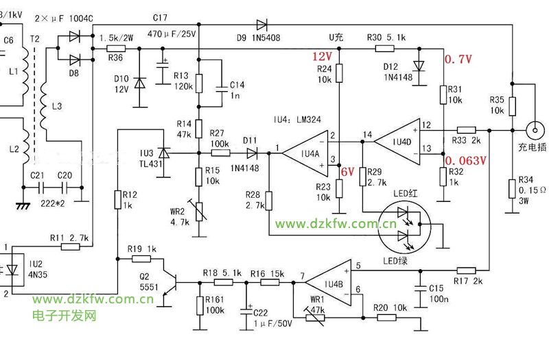 R34是电流取样电阻,当充电电流大于0.42A(0.063V/0.15R = 0.42A)时,IU4D的同相端大于反相端,运放输出电源电压,LED红亮起